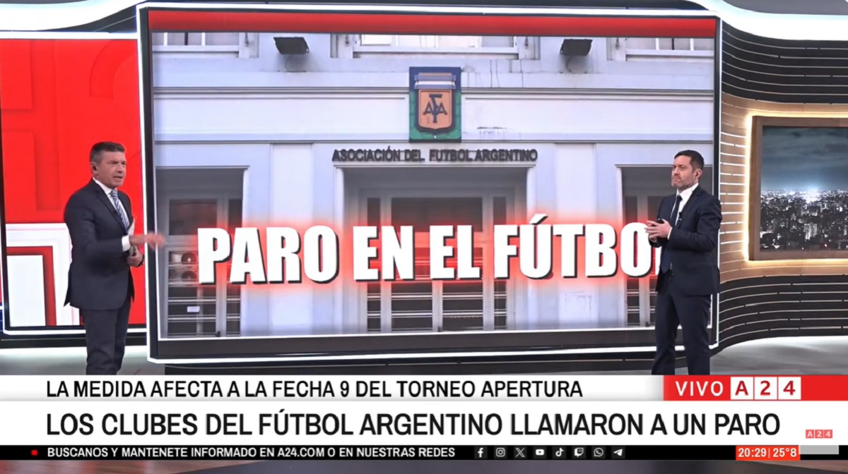 Hora 20 febrero 24, 2026Paro en el fútbol: la medida afectará a la fecha 9 del Torneo Apertura La AFA decidió suspender la Liga Profesional tras una denuncia de ARCA por evasión fiscal, alineando a todos los clubes.