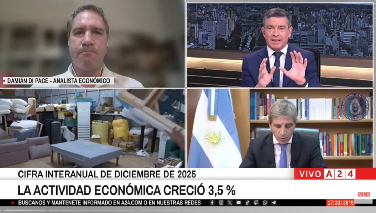 Hora 20 febrero 25, 2026La actividad económica creció 3,5% Conversamos con el economista, Damián Di Pace, sobre la cifra que dio el Gobierno.