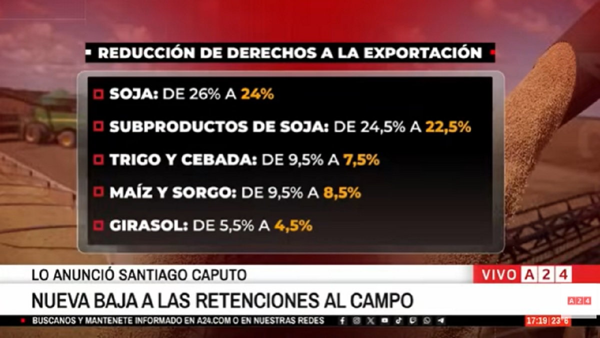 Hora 17 diciembre 11, 2025Impulso para el campo: nueva baja de retenciones El ministro de Economía, Luis Caputo, anunció una sorpresiva baja de retenciones a productos agropecuarios